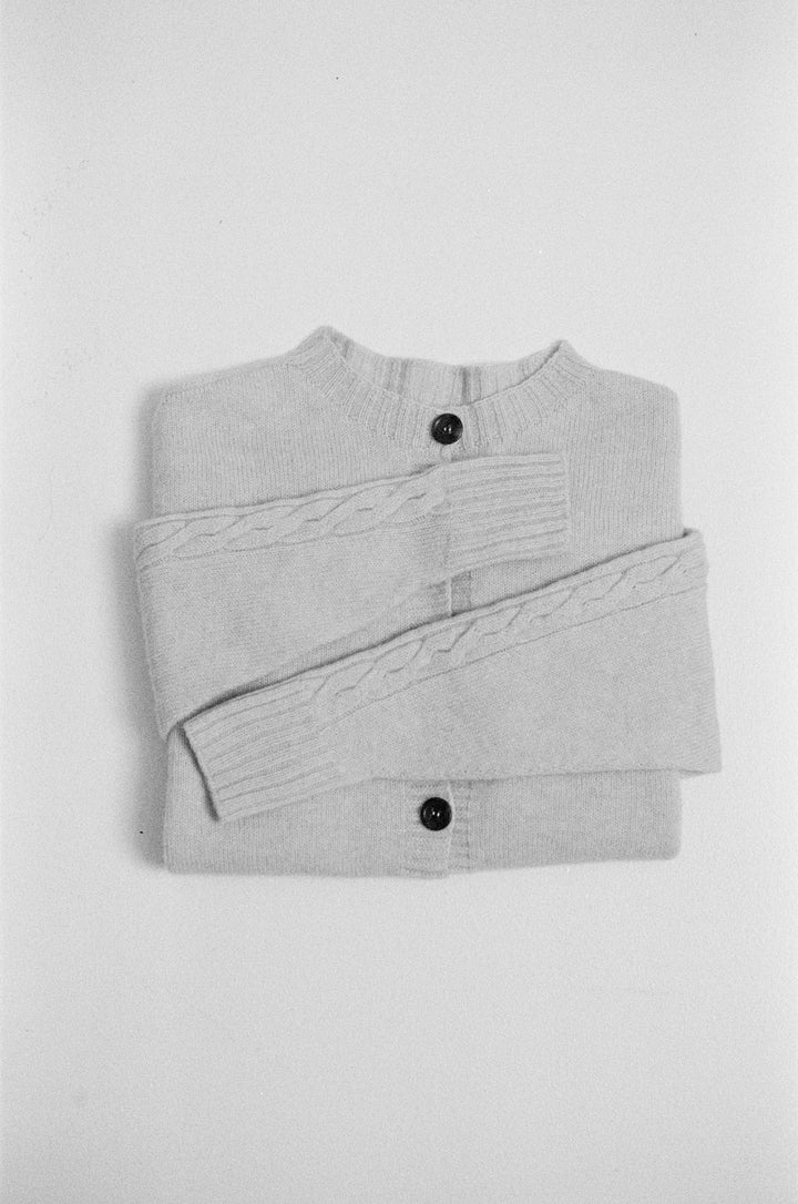 Knitted in our textured merino wool with cables on the sleeve and the back for a touch of nostalgia without the bulk. A locally crafted heirloom, finished with Japanese resin buttons.